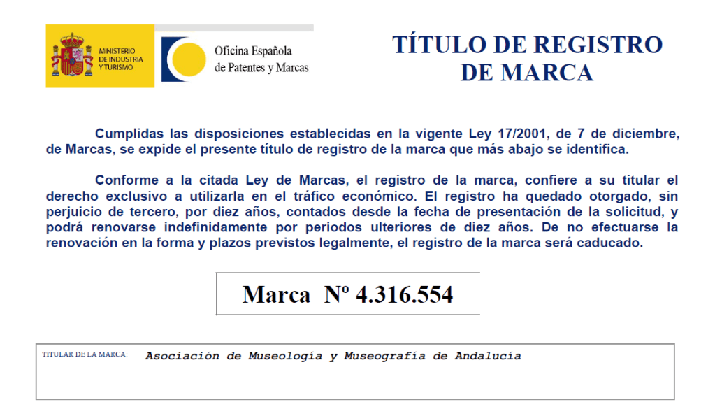 Hoy compartimos una noticia muy importante para la asociación de museología y Museografía de Andalucía, como organizadora de los Premios EXPONE, y para toda la comunidad profesional a la que representamos: los Premios EXPONE ya son oficialmente Marca Registrada.
