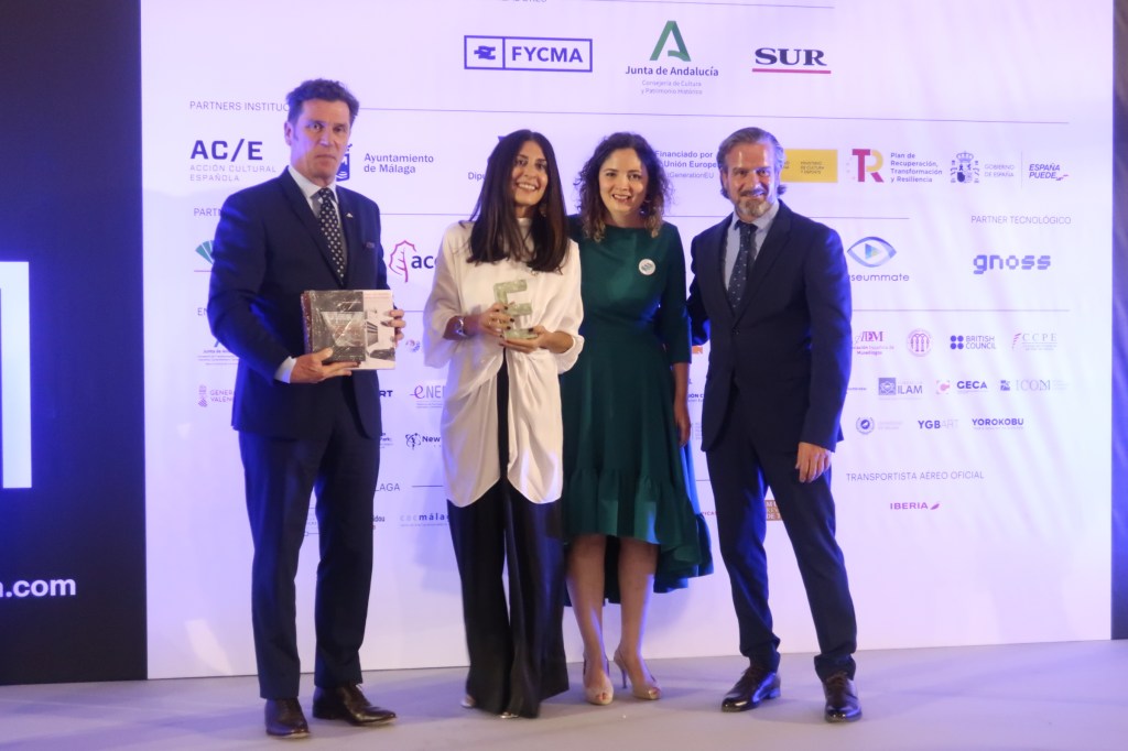 La entrega de la estatuilla de este premio estuvo a cargo de Emilia Garrido, responsable de artes plásticas y espacios expositivos de la Fundación Unicaja y de Rosina Gómez-Baeza, miembro del jurado de esta edición y directora de YGBART.